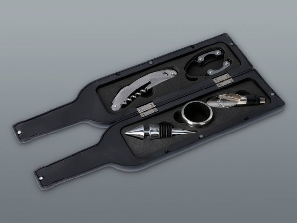 Praktikus szerszámcsomag a borászok számára , szép kivitelben, borosüveg alakban.