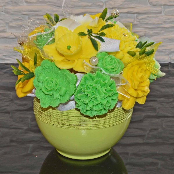 A kerámiaedényben lévő szappancsokor illatos ajándék bármely nagynéninek vagy nagymamának az ünnepekre.